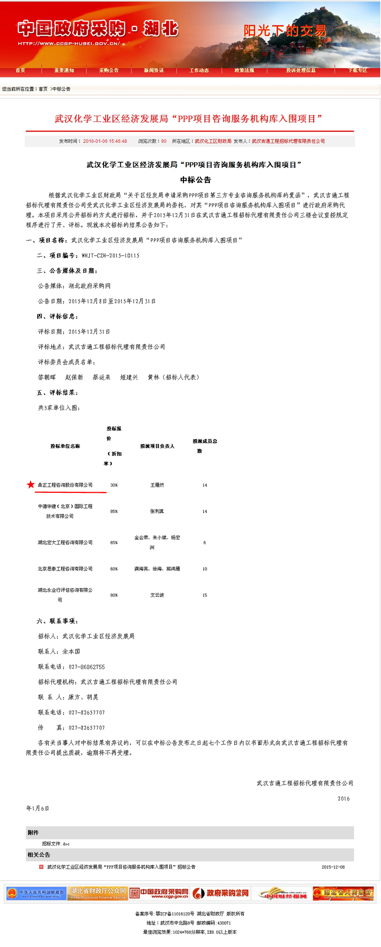 【經營成果】我司入圍武漢化學工業區經濟發展局“PPP項目咨詢服務機構庫”