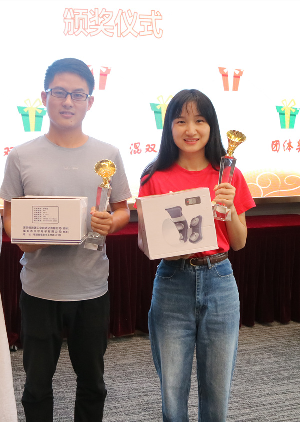 混雙二等獎獲得者楊峰、胡章蓉合影留念