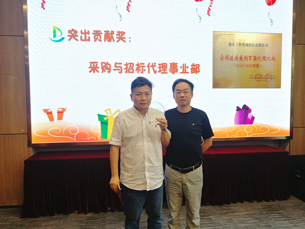 值得一提的是,今年七月我司憑借專業的服務、完善的內控制度從近千家政府采購代理機構中脫穎而出,獲得首屆“全國政府采購百強代理機構(2018-2019年度)”榮譽稱號,這一榮譽稱號離不開采購與招標事業部全體成員積極主動的參評。董事長王雁然為采購與招標事業部頒發突出貢獻獎,并號召大家向采購與招標事業部學習大局意識和吃苦耐勞的工作作風。